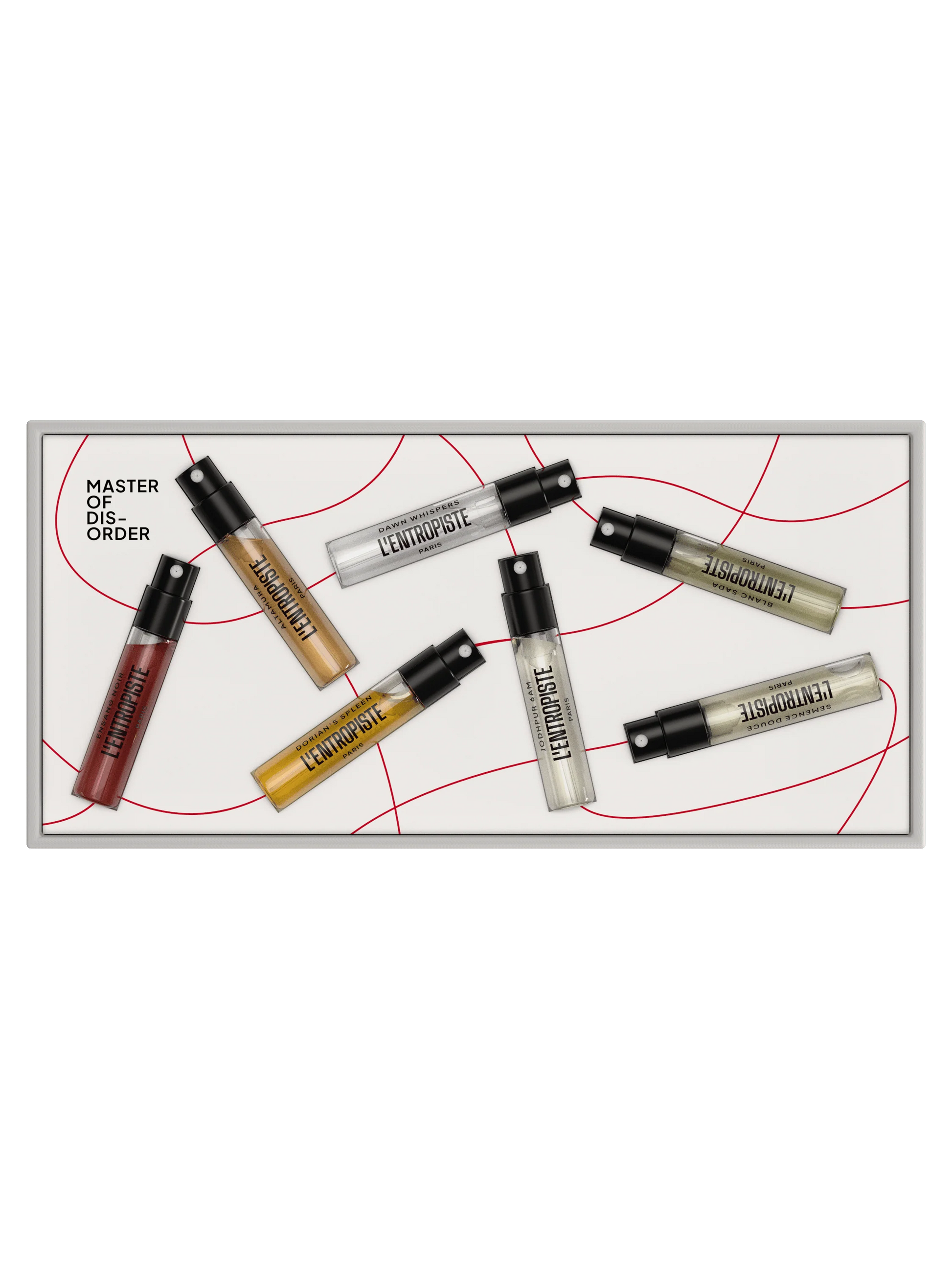 The Discovery Set includes seven 2.5ml samples from the L'Entropiste collection: Ensang Noir, Dorian's Spleen, Blanc Sada, Semence Douce, Dawn Whispers, Jodhpur 6am, and Altamura.